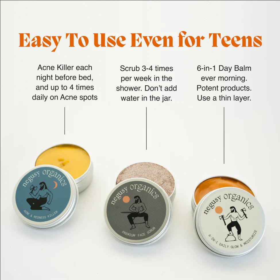 Use the 6-in-1 every morning, and the acne killer every night before bed. The industry standard is to put 70% water in their products. We have 0% water. You only need a small amount of balm. To get faster results, apply the acne killer 3-4 times per day.
