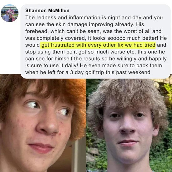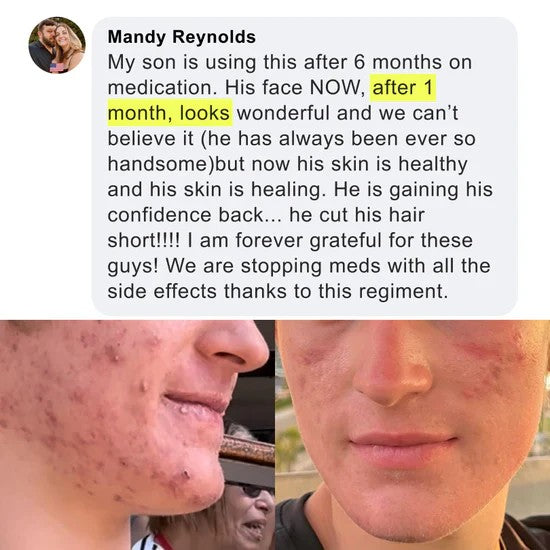 I have to tell you how much your products have helped my son in just the first week alone. I'm so happy we take progress pictures to show the improvement! My son has scarring from very painful cystic acne and your acne ritual is really helping to fade the scars. He will still get a tiny pimple every now and then but they are so tiny and go away in the next day or two. We are loving the progress so far. Thank you!!